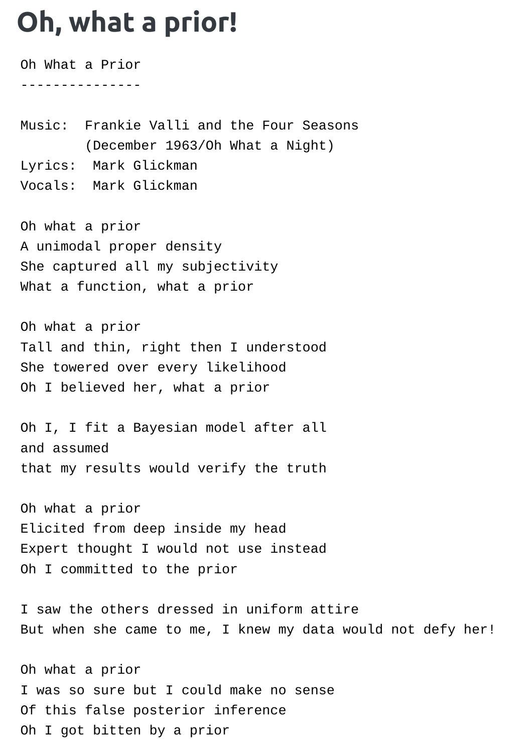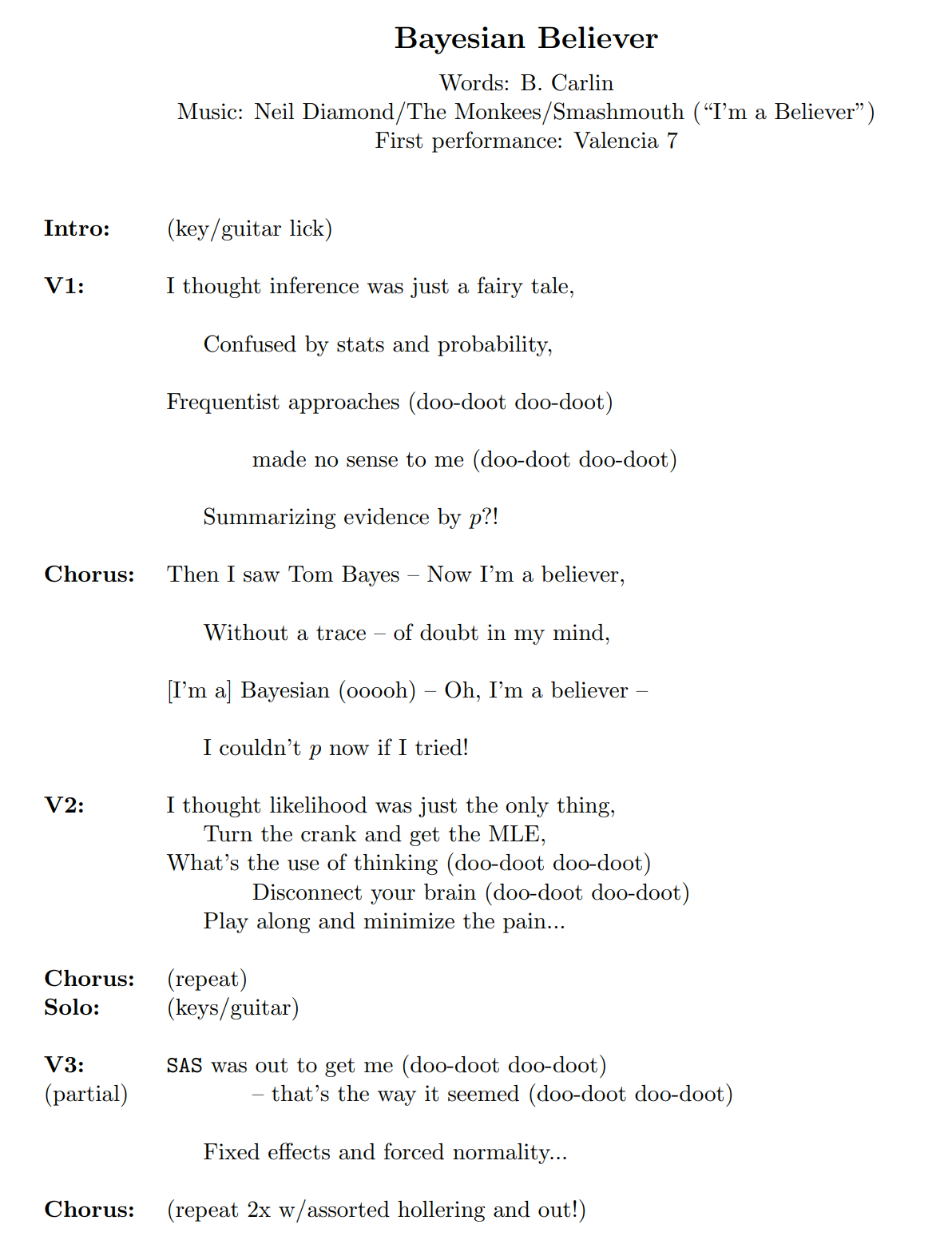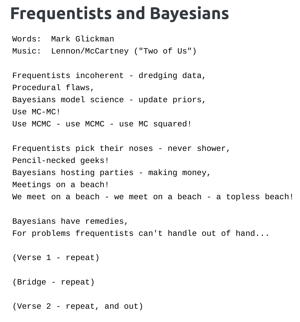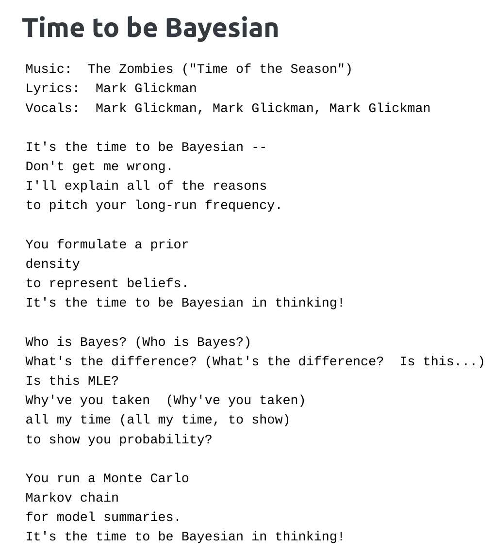The Bayesian Songbook contains the main gospels, often performed at the World Meetings in Bayesian Statistics. Some recorded songs from Mark Glickman’s Music webpage are linked below, with Lyrics to help you sing along.