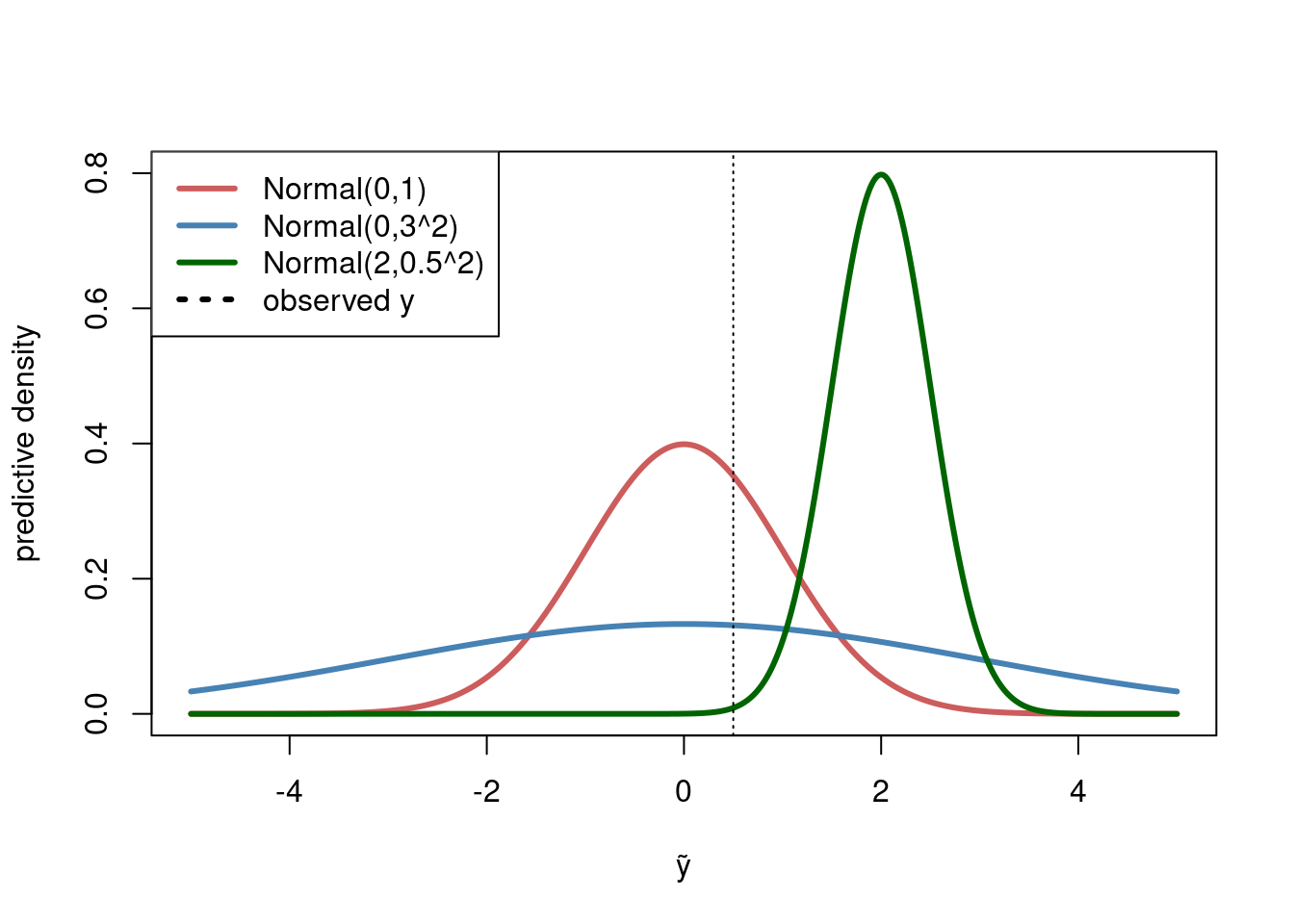 where \(p(\tilde{y}_i\vert \boldsymbol{\theta})\) is just the model density, or, for discrete data, the probability (mass) function. When the predictive density \(p(\tilde{y}_i\vert \boldsymbol{\theta})\) is evaluated at the observed data point\(y_i\), we call the resulting density value, \(p(y_i\vert \boldsymbol{\theta})\), the density score for the \(i\)th observation. A good model would give high density scores for all (or most) observations in the dataset, i.e. \(p(y_i\vert \boldsymbol{\theta})\) is large for all \(i=1,\ldots,n\). The figure below illustrates several predictive densities and the density scores at a given test point \(y=0.5\) (dashed line). The red density has a better score for the observed \(y=0.5\) data point than the wide blue density, and much better than the green density that is over-confident and essentially misses the observed data point and obtains a very low density score. This shows that a good model should: