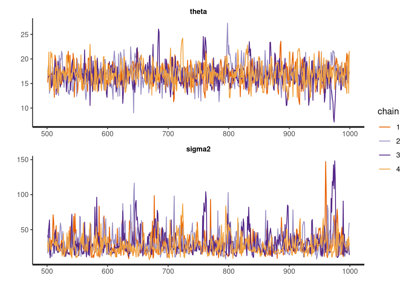 # Plot trajectoriestraceplot(fit, pars =c("theta", "sigma2"), nrow =2)