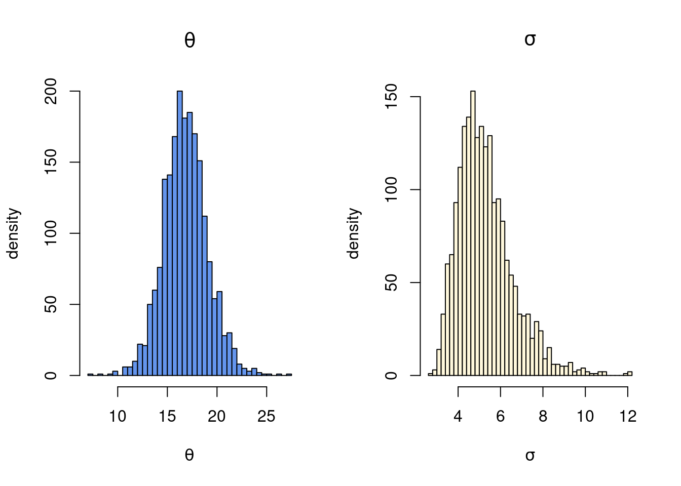 # extract drawspostDraws =extract(fit, pars =c("theta", "sigma2"), permuted =TRUE) par(mfrow =c(1,2))hist(postDraws$theta, 50, freq =TRUE, col ="cornflowerblue",xlab =expression(theta), ylab ="density", main =expression(theta))hist(sqrt(postDraws$sigma2), 50, freq =TRUE, col ="cornsilk", xlab =expression(sigma), ylab ="density", main =expression(sigma))