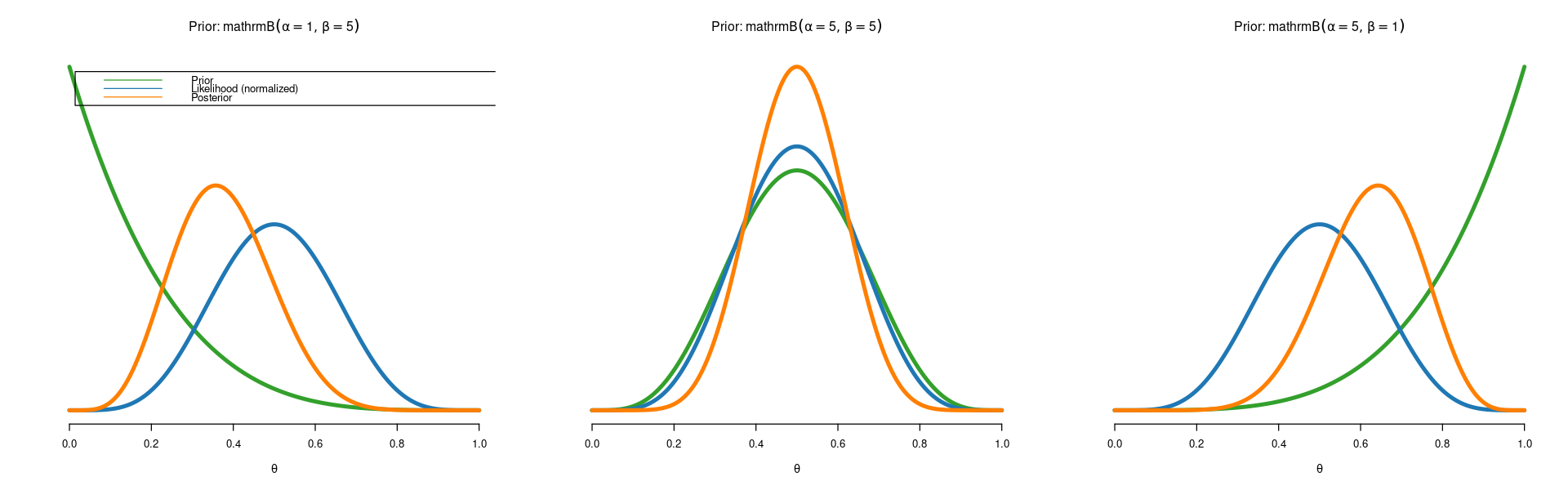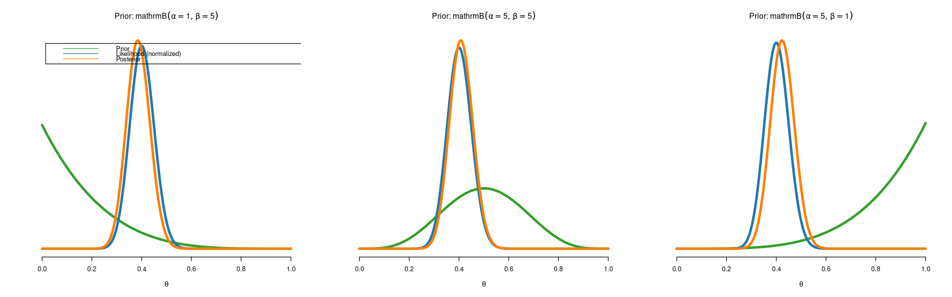 Since we only have \(n=10\) data points, the posteriors for the three different priors differ a lot. Priors matter when the data are weak. Let’s try with the \(n=100\) first observations.