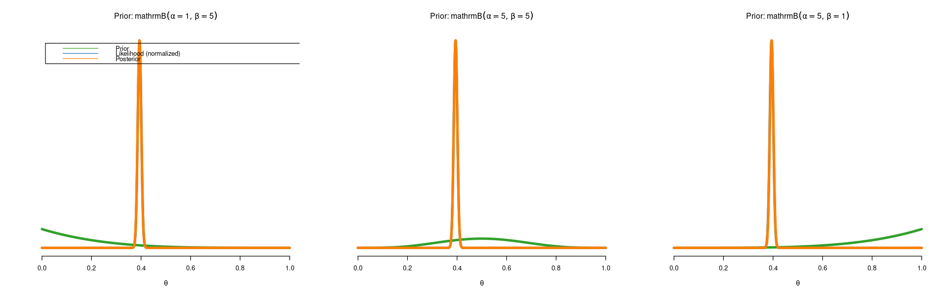 We see two things: * The effect of the prior is completely gone. All three prior give identical posteriors. We have reached a subjective consensus among the three persons. * We are quite sure now that the spam probability \(\theta\) is around \(0.4\).