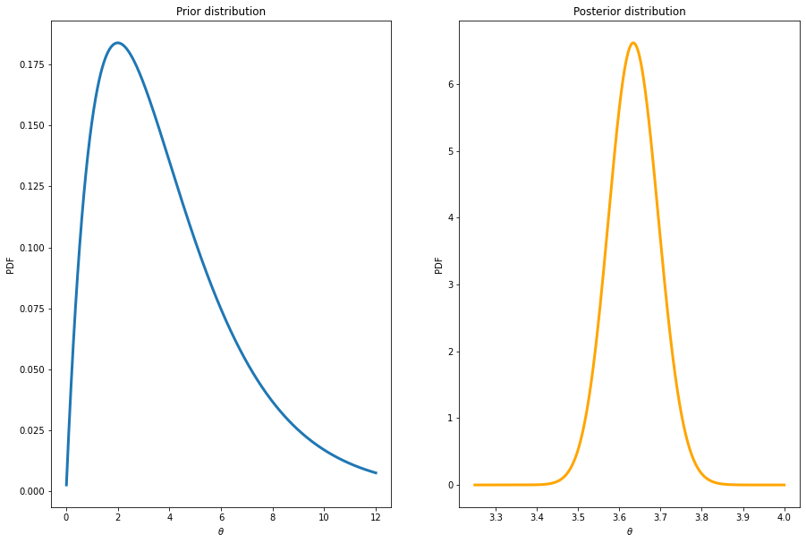 thetaPriorGrid = np.linspace(0.01,12,10000), thetaPostGrid = np.linspace(3.25,4,10000))Number of data points = 1000
