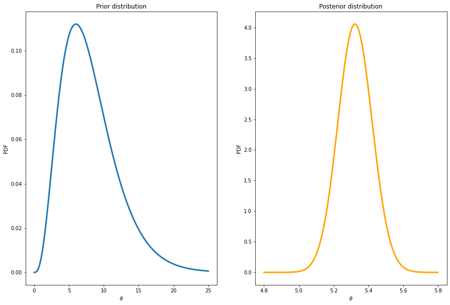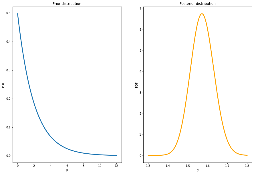 ax[1].set_xlabel(r'$\theta$');ax[1].set_ylabel('PDF');